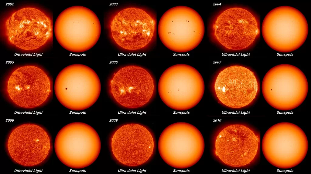 - Bintik Matahari (Sunspots): Bintik matahari adalah area di permukaan Matahari yang lebih dingin dan lebih gelap daripada area sekitarnya karena medan magnetik yang kuat. Jumlah bintik matahari mengalami fluktuasi selama siklus matahari sekitar 11 tahunan. Ketika jumlah bintik matahari meningkat, ini disebut puncak aktivitas matahari, dan saat jumlahnya menurun, ini disebut minimum aktivitas matahari.
