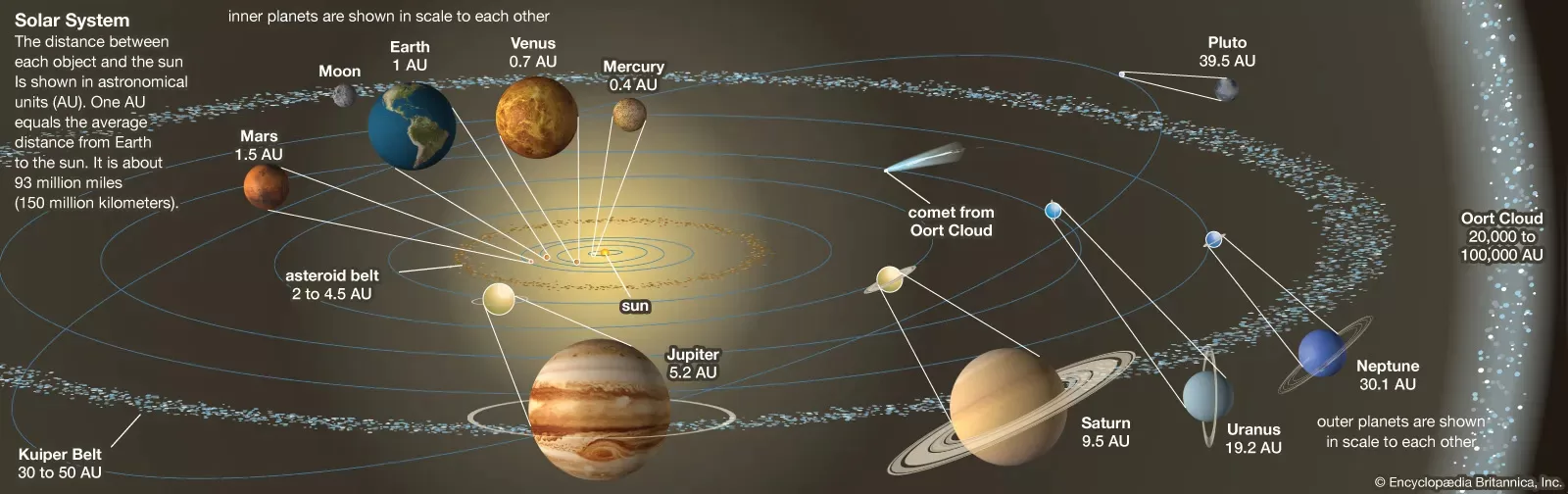 - Oort Cloud: Oort Cloud adalah daerah yang jauh lebih jauh dari tata surya utama dan berisi komet yang terjebak oleh gravitasi Matahari.