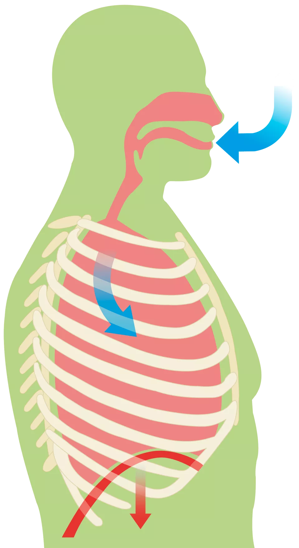 Setelah melewati hidung atau mulut, udara masuk ke faring (tenggorokan), lalu ke laring (pipa suara). Laring berfungsi sebagai penghubung antara faring dan trakea.