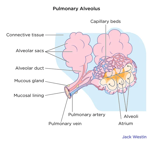 Di alveolus, oksigen dari udara yang dihirup masuk ke dalam darah dan diangkut oleh sel darah merah ke seluruh tubuh. Pada saat yang sama, karbon dioksida yang dihasilkan oleh sel-sel tubuh diangkut oleh darah kembali ke paru-paru dan dikeluarkan melalui proses eksalasi.