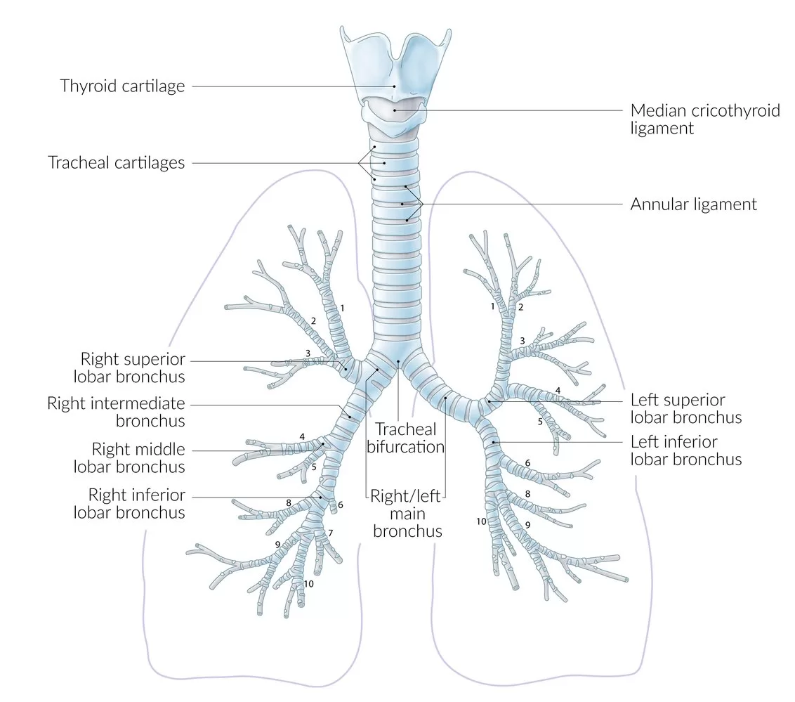 Udara kemudian masuk ke trakea, tabung berotot yang terletak di depan tenggorokan. Trakea ini bercabang menjadi dua bronkus, satu menuju setiap paru-paru.